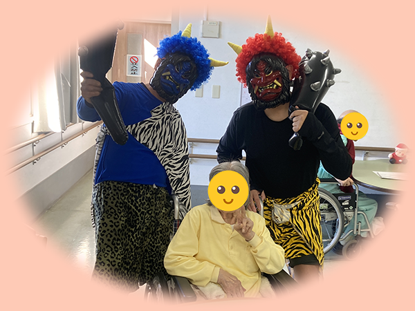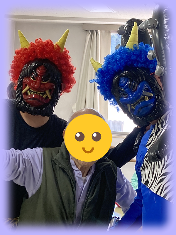 今年も赤鬼さん・青鬼さんがはなもも苑に登場し、利用者の皆さまと一緒に、季節の変わり目に生じるとされる邪気(鬼)を払い、1年の無病息災を願いました(^^)