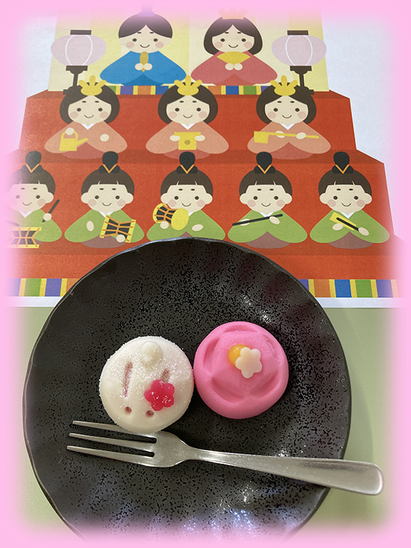 ひな祭りのBGMを聴きながら、可愛らしいお顔のお内裏様とお雛様の練り切り和菓子を食べました(*^_^*)