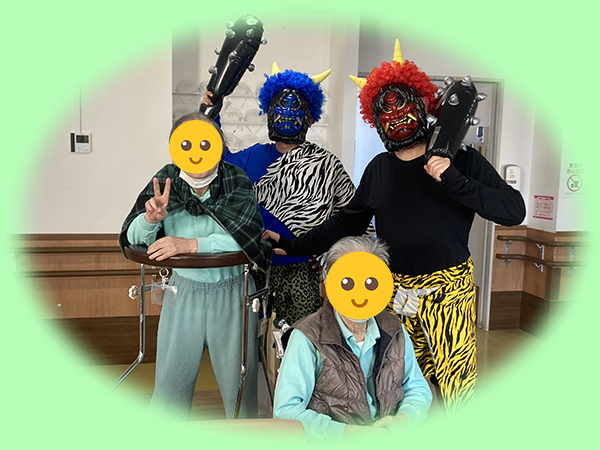 今年も赤鬼さん・青鬼さんがはなもも苑に登場し、利用者の皆さまと一緒に、季節の変わり目に生じるとされる邪気(鬼)を払い、1年の無病息災を願いました(^^)