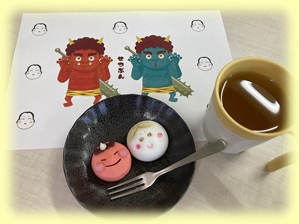 おやつには季節の和菓子「赤鬼とおたふく」をご用意し、皆さまに楽しんでいただきました。