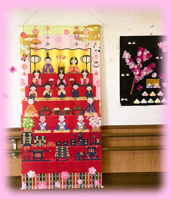 BGMや飾り付けで季節を感じていただき、『うれしいひなまつり』を皆さまと一緒に歌い、和やかな時間となりました。おやつには季節の和菓子をお楽しみいただきました(^^♪