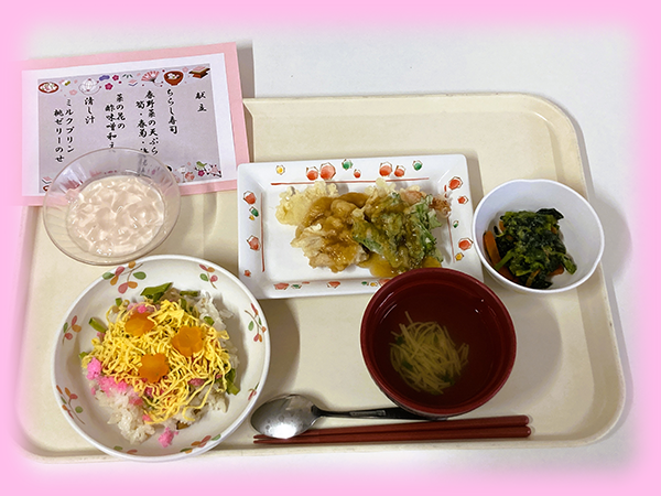 また、3月3日(火)ひな祭り当日の行事食では「ちらし寿司・春野菜の天ぷら・菜の花の酢味噌和え・清し汁・ミルクプリン桃ゼリーのせ」を提供し、彩り豊かな春の献立に笑顔が見られました。