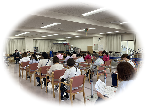当施設にて皮膚科の診療をしていただいております亀山先生より「高齢者の皮膚トラブル。介護施設での安全管理」についてご講義頂きました。介護、看護、リハビリ、デイケア、ケアマネジャー等が参加いたしました。講義の後も介護についての気持ちのこもったディスカッションを職員同士で活発におこないました。講義で学んだことを、施設利用者さまへ反映して参りたいと思います。
