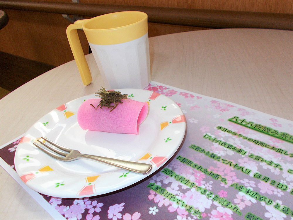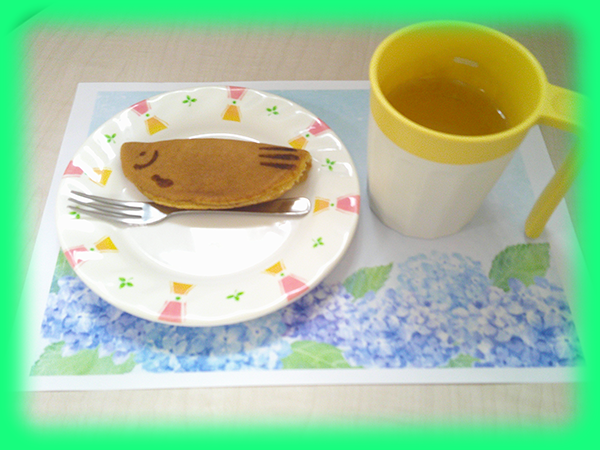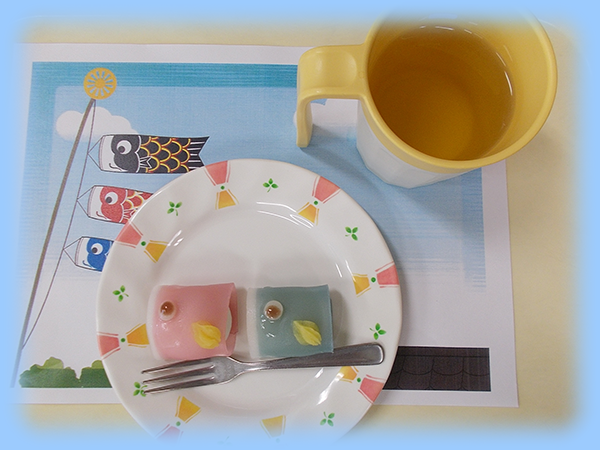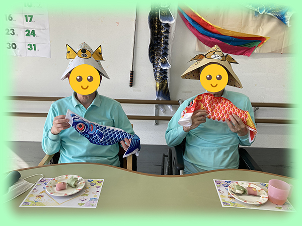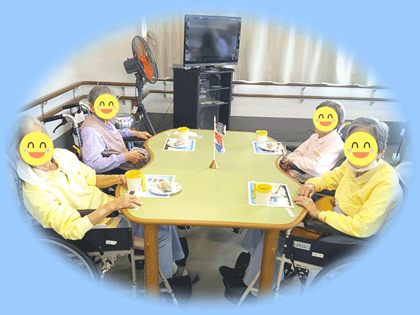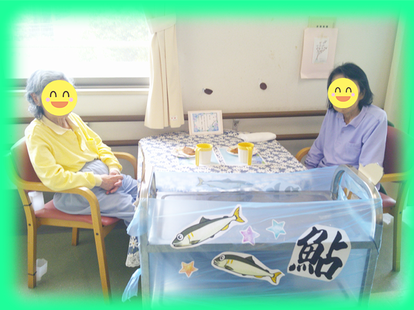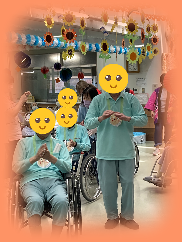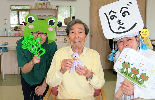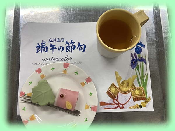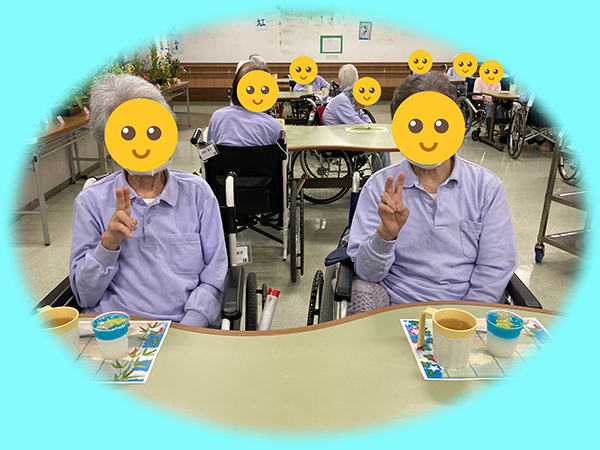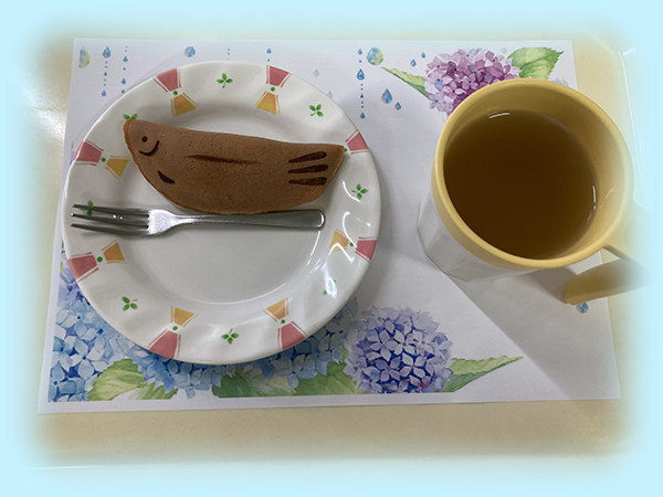 「かえるのうたが~、聞こえてくるよ~♪♪」梅雨の時期を楽しめるように、「かえるの歌声喫茶」と題して、童謡の「雨ふり」に合わせた踊りや、ご利用者さんによる「かえるのがっしょう」の輪唱を行いました。そして、職員手作りの「てるてる坊主」のプレゼントや、「季節の和菓子“若鮎”」を楽しみました。