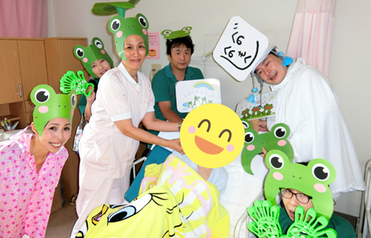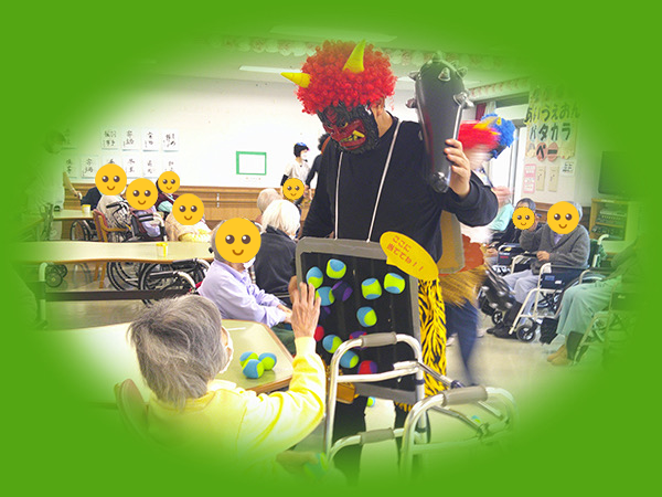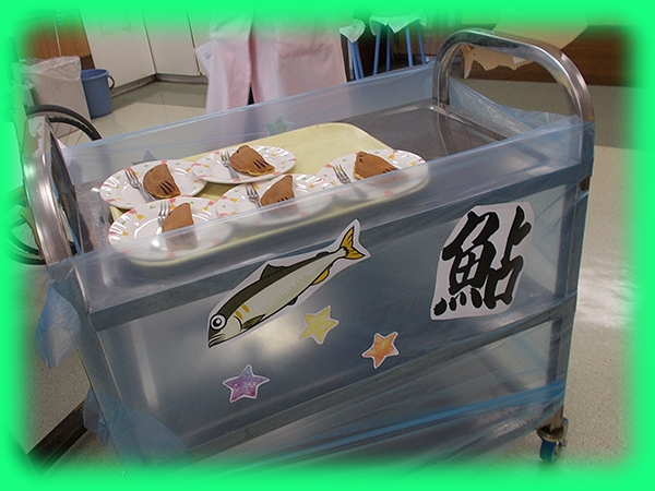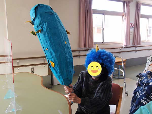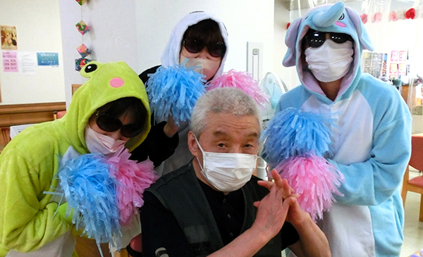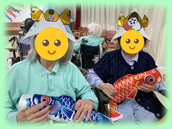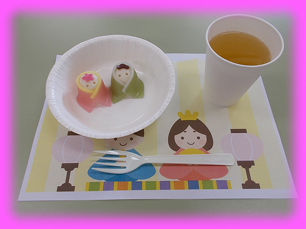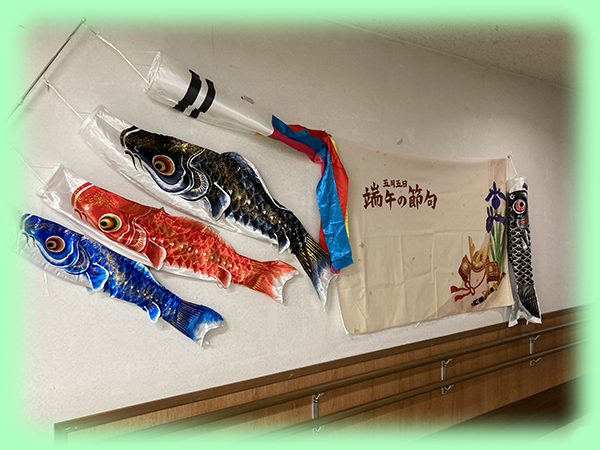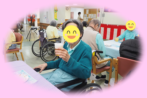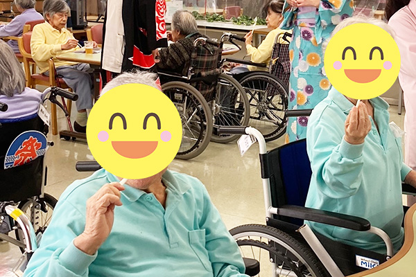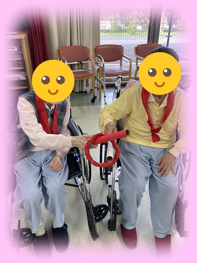 「かえるのうたが~、聞こえてくるよ~♪♪」梅雨の時期を楽しめるように、「かえるの歌声喫茶」と題して、童謡の「雨ふり」に合わせた踊りや、ご利用者さんによる「かえるのがっしょう」の輪唱を行いました。そして、職員手作りの「てるてる坊主」のプレゼントや、「季節の和菓子“若鮎”」を楽しみました。
