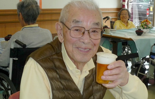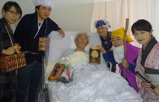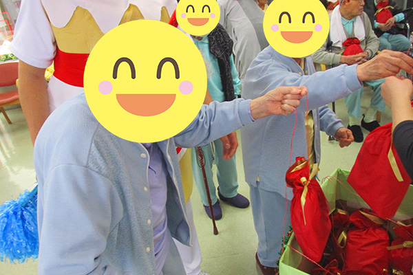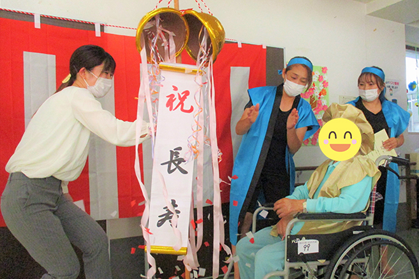 お昼は豪華なお祝い膳とノンアルコールビール。午後は、水戸黄門様御一行が長寿のお祝いに来苑し、おみくじを引いて、景品を皆さんにプレゼントしました。