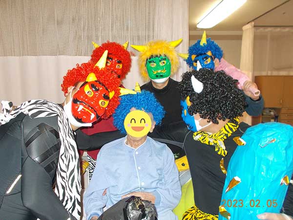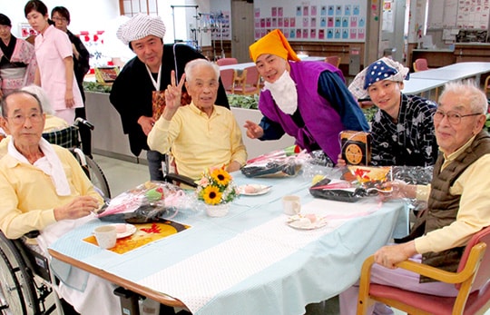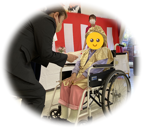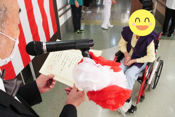 午前中は、ご家族にも参加いただき、表彰の対象となる17名の利用者様には、色とりどりのちゃんちゃんこを着ていただき、表彰式を行いました。皆様の笑顔がとても印象的で、温かな雰囲気に包まれました。