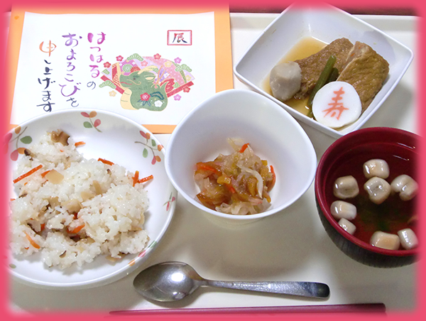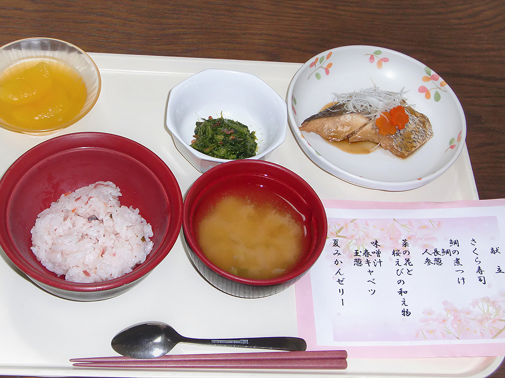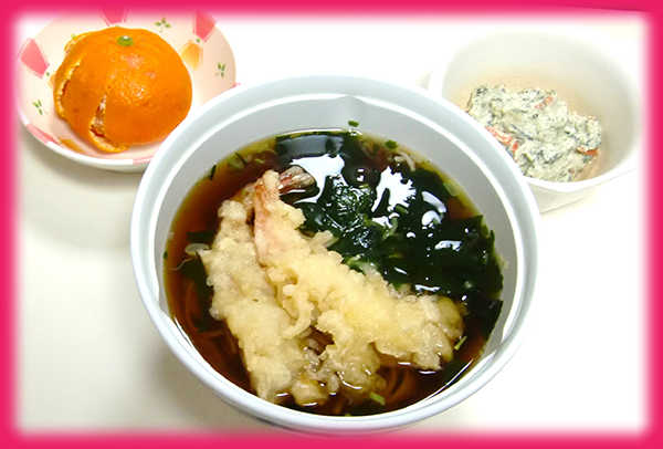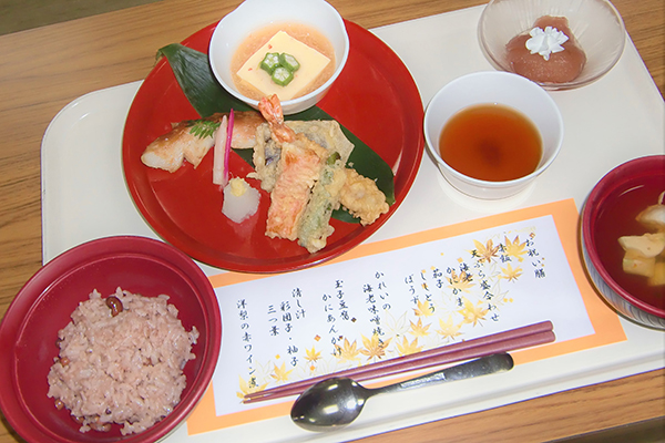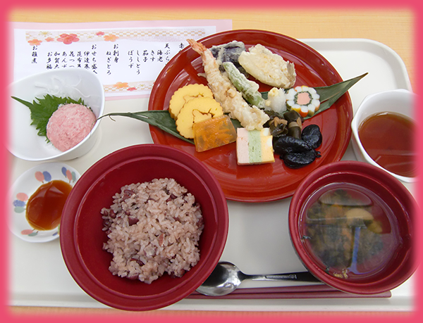 お昼は、『天ぷら盛り合わせ』『カレイの照り焼き』『茶碗蒸しカニあんかけ』など、 豪華な行事食に笑顔があふれていました(^^♪