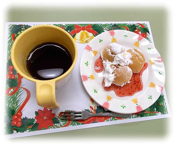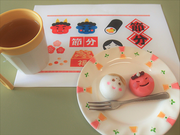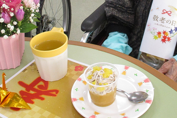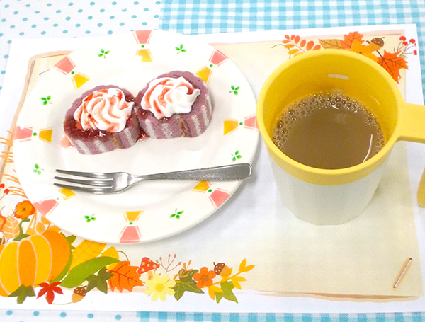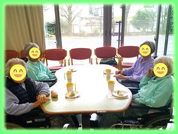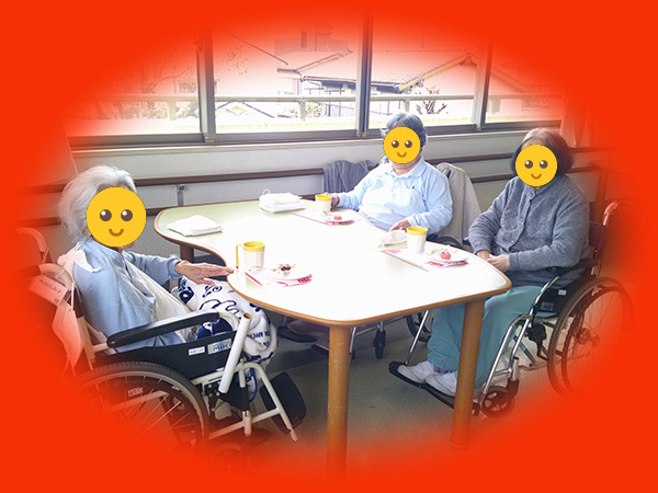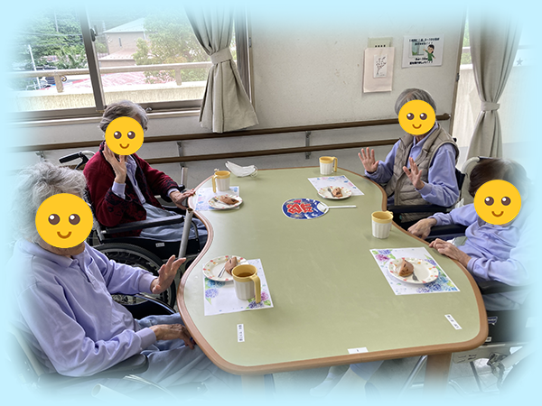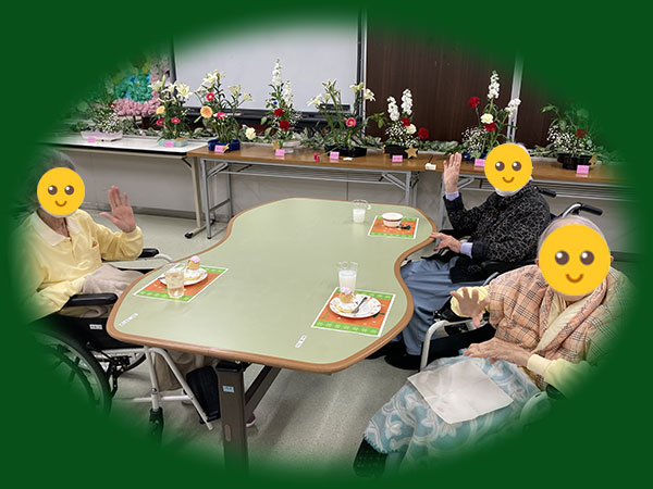 普段のおやつの時間が、苑内喫茶に変身。職員手作りのテーブルフラワーとテーブルクロスで、食堂が華やかなカフェに♪