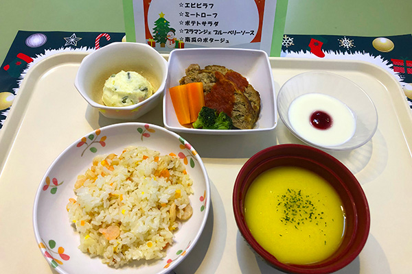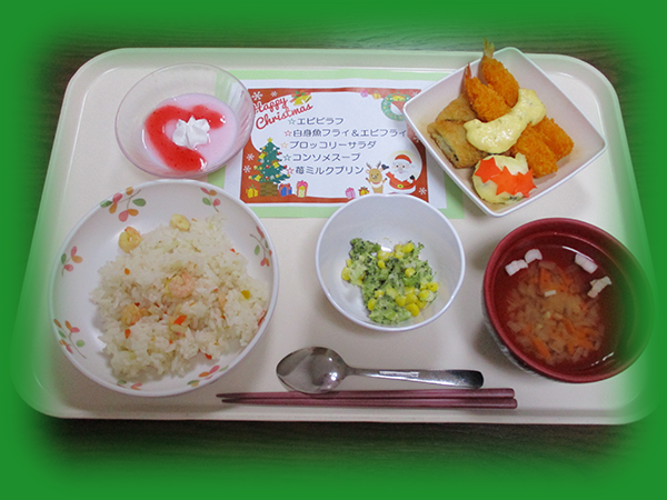 お昼は、行事食をご提供しました。メニューは『サフランライス・白身魚フライ&エビフライ・ブロッコリーサラダ・コンソメスープ・苺ミルクプリン』彩り豊かで、皆さまに大変喜んでいただけました。
