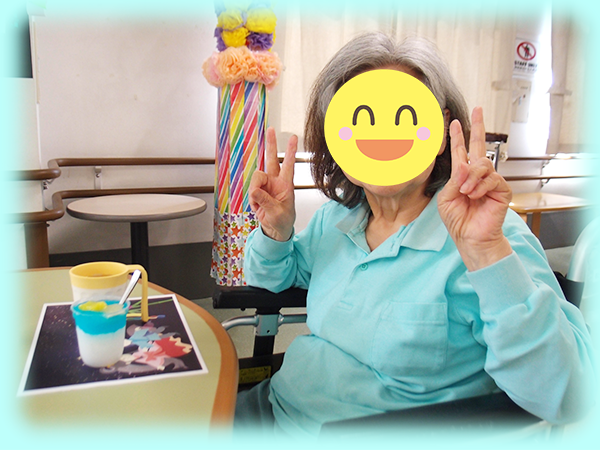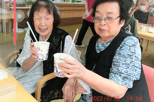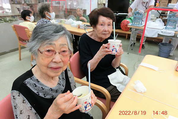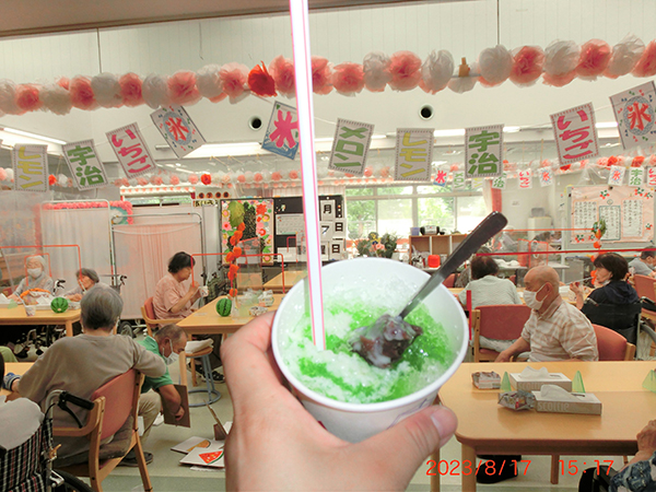 たくさん動いた後の、かき氷は格別でしたよ!「若い頃はもっと、踊れたのに~」等、笑顔で話す利用者様が印象的でした。