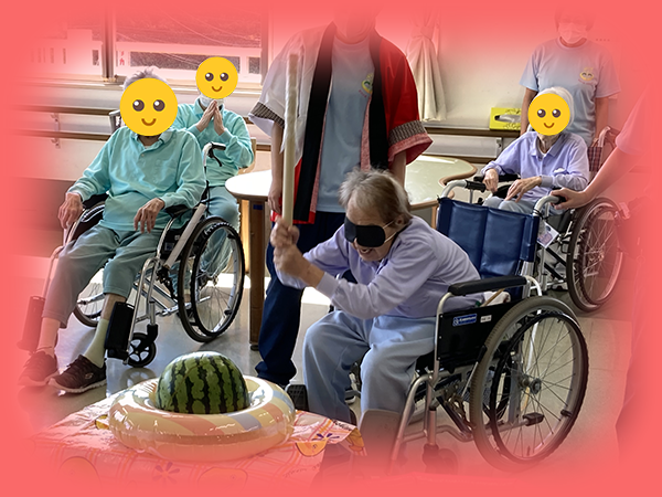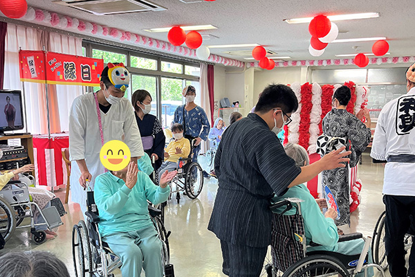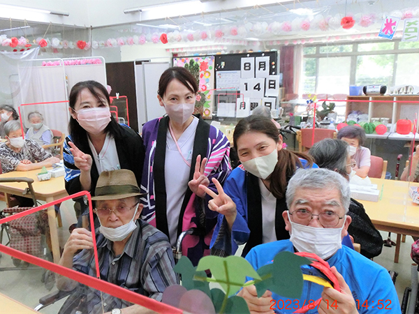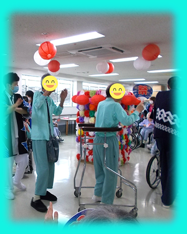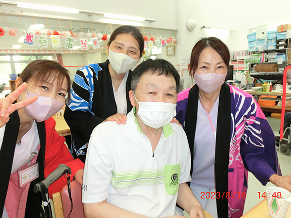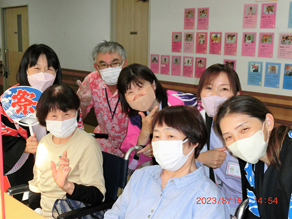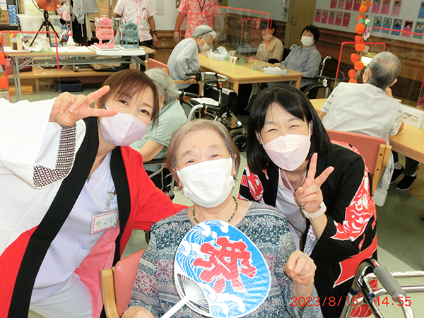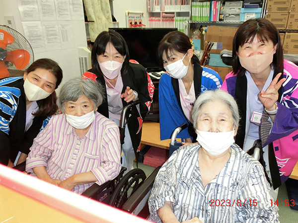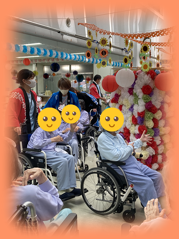 やぐらを囲み、皆さんで盆踊りを楽しみました。車いすをご利用の方も、職員が一緒に踊りながら、笑顔で参加されていました♫