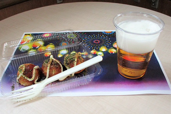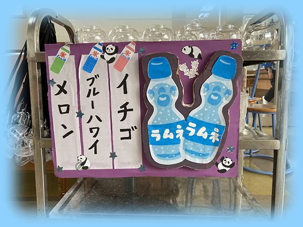 ラムネはイチゴ・メロン・ブルーハワイの3種類からお好きな味を選び、かわいいパンダ型の容器で飲んでいただきました。まるで縁日に来たような気分を味わっていただけたと思います!(^^)!