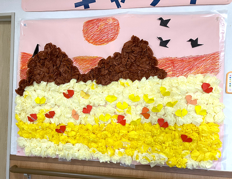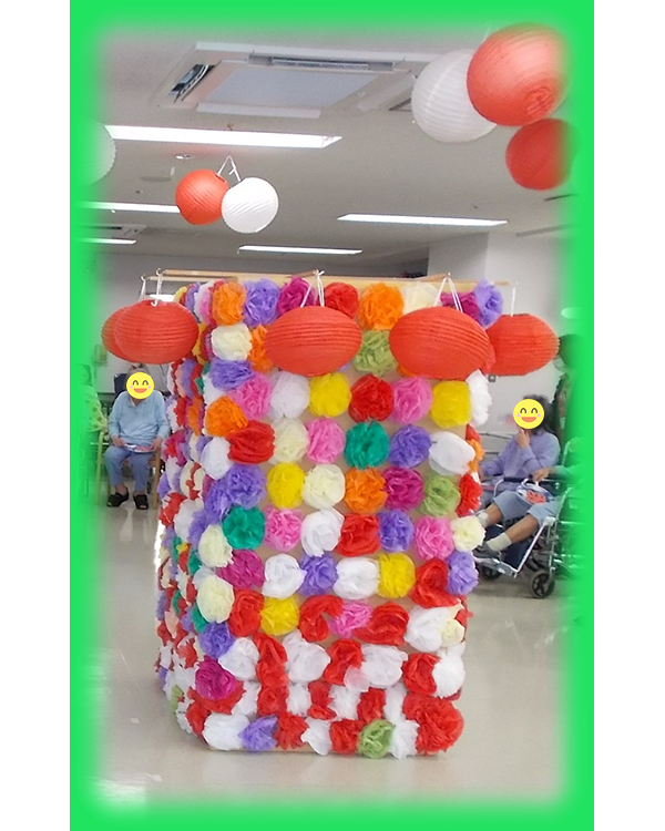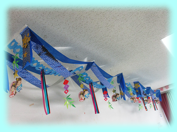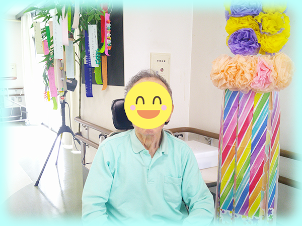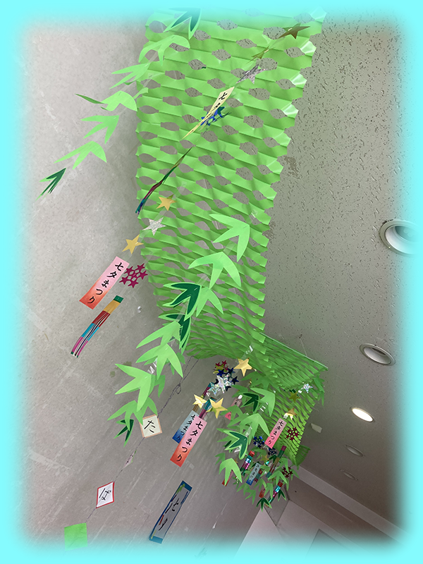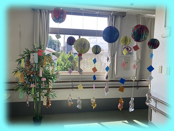 願い事を書いた短冊を皆で笹に飾り付けました。また、職員が制作した吹き流しなども飾り、七夕らしい季節の雰囲気を感じていただけるよう工夫しました。