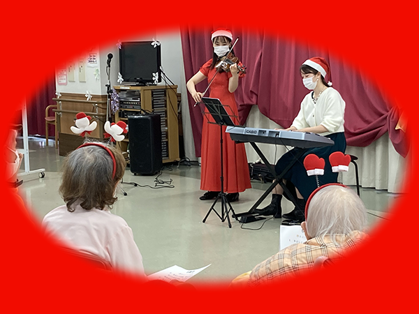 バイオリニストさんとピアニストさんをお招きし、クリスマスソングを中心に演奏していただきました。鈴を鳴らしたり、手拍子をしたり、一緒に歌ったりと、会場全体が音楽に包まれました♪